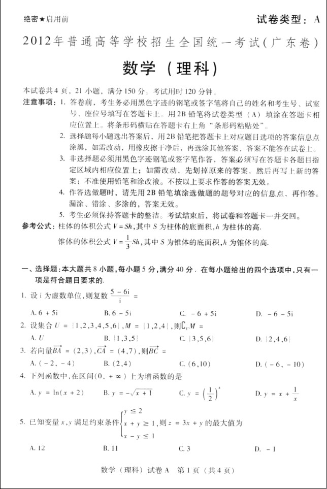 2012年普通高等学校招生全国统一考试广东卷A(数学理)扫描版无答案