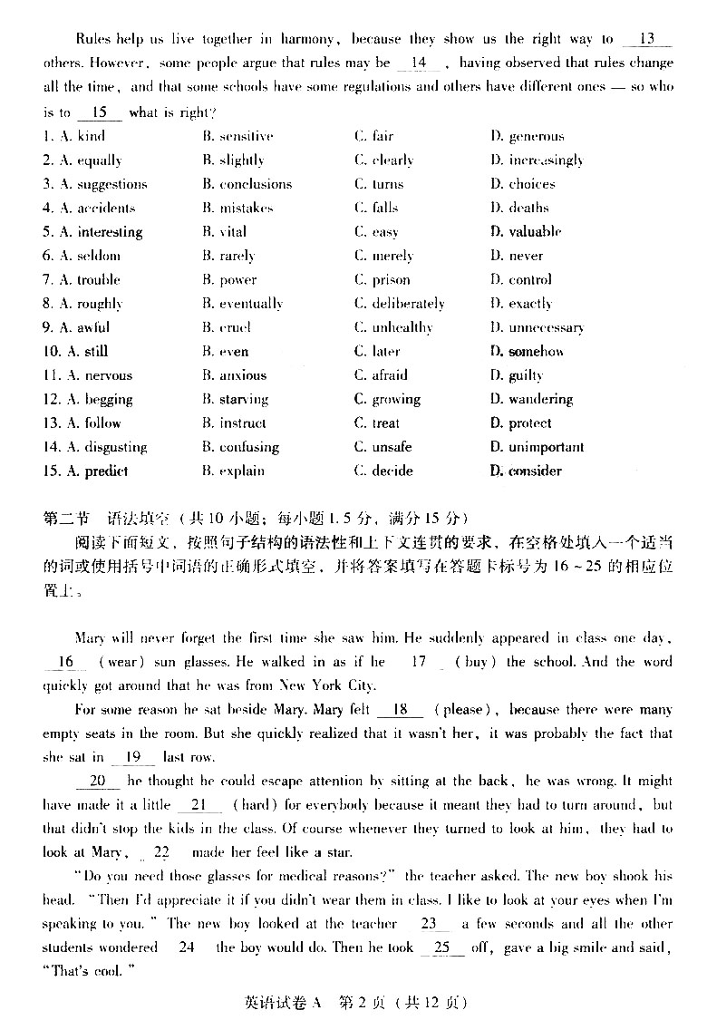 2012年普通高等学校招生全国统一考试广东卷A(英语)扫描版缺答案
