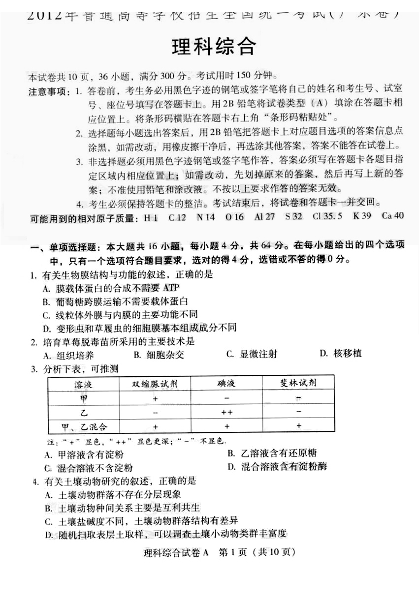 2012年普通高等学校招生全国统一考试广东卷A(理综)扫描版缺答案