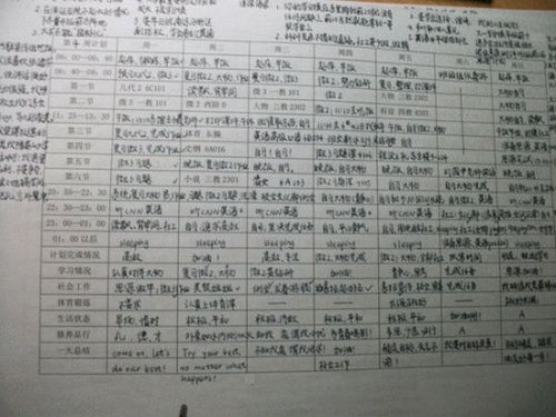 马冬晗这不到6分钟的答辩紧凑地宣传了自己的“光辉学史”:三年学分总成绩班级第一;各种科研、竞赛获奖28项;精仪系各类球队的队长,还能跑马拉松、主持晚会、朗诵诗歌。有网友调侃马冬晗是“全能女神”,尤其是她那张密密麻麻的周计划表,成了网友们膜拜的“神器”:她把每天的时间都切割到了每一个小时,何时做微积分的习题,何时开班会,都精确到分钟,连午休的那一个钟头都能挤进去两三件事,睡觉也只留了5个小时。