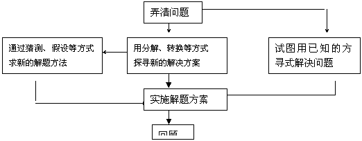 G.波利亚把数学问题的解决过程分为四个阶段:弄清问题、拟定计划、实施计划、回顾,依据此原则,笔者把化学问题的解决粗分为五个阶段:弄清问题、已知解决方式的使用、新解决方法的寻找、实施寻到的方法、回顾。这五个阶段可用下图表示: