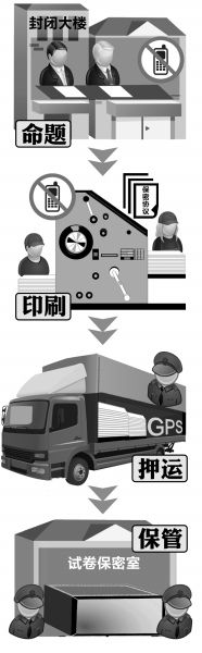 高考试卷全部印好后,一般在高考前2天,就由武警官兵武装押送到各区县招考部门,放进“试卷保密室”。