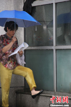 在无人的角落,一位家长正在看高考杂志,她的半边裤腿已经被雨打湿。