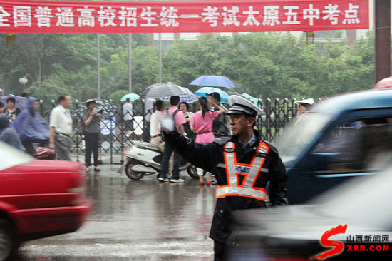 “快过,快过……”今晨的大雨让五中考点门前积水严重,马路中央形成了一个大水坑。负责该考点的太原迎泽区一大队队长刘新民站在水坑里,雨水飘在脸上,皮鞋变成了雨鞋,但仍然有序疏导交通。
