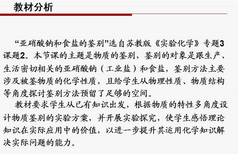 2010年全国高中化学优质课观摩评比暨教学改革研讨会说课课件:亚硝酸钠和食盐的鉴别(浙江 甘建国)