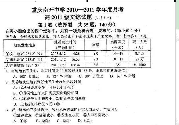 重庆市南开中学2011届高三3月月考试卷(文综)扫描版