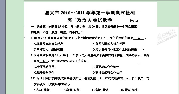 浙江省嘉兴市10-11学年高二上学期期末测试A卷(政治)扫描版