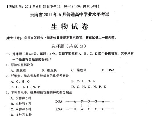 云南省2011年6月普通高中学业水平考试(生物)扫描版无答案