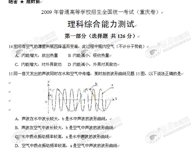 2009年普通高等学校招生全国统一考试重庆卷(理综)物理