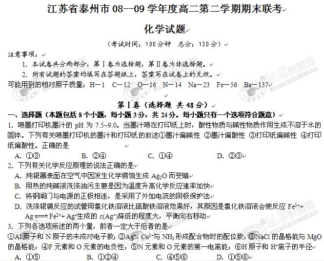 江苏省泰州市08-09学年高二下学期期末联考(化学)