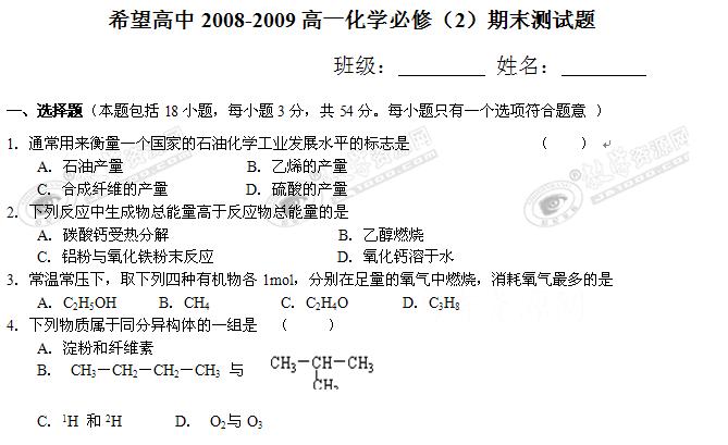 陕西省渭南市希望中学08-09学年高一下学期期末考试(化学)