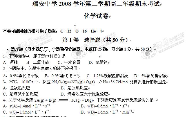 浙江省瑞安中学08-09学年高二下学期期末考试(化学)