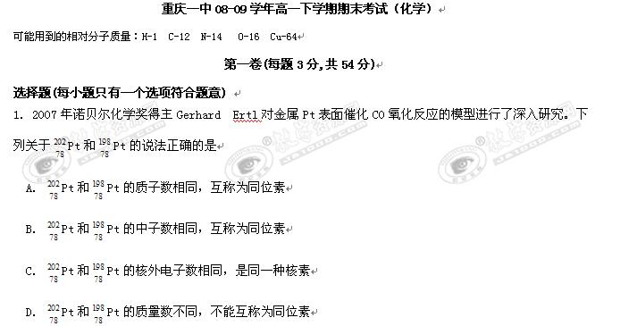 重庆一中08-09学年高一下学期期末考试(化学)