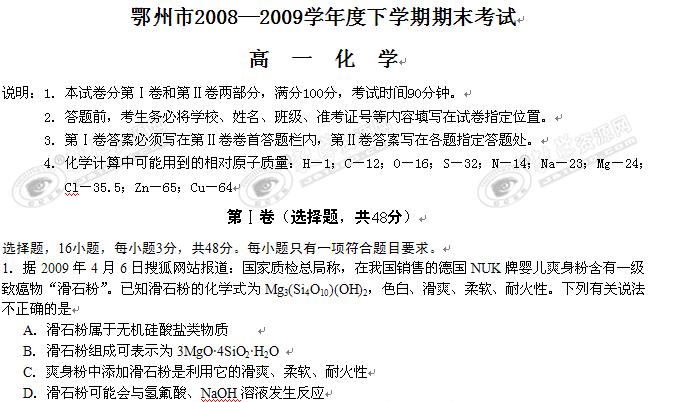 湖北省鄂州市08-09学年高一下学期期末考试(化学)