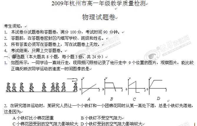 浙江省杭州市08-09学年高一下学期期末考试(物理)