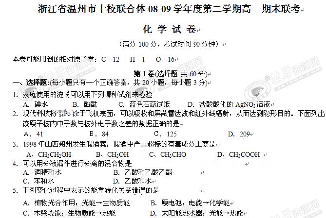 浙江省温州市十校联合体08-09学年高一下学期期末联考(化学)