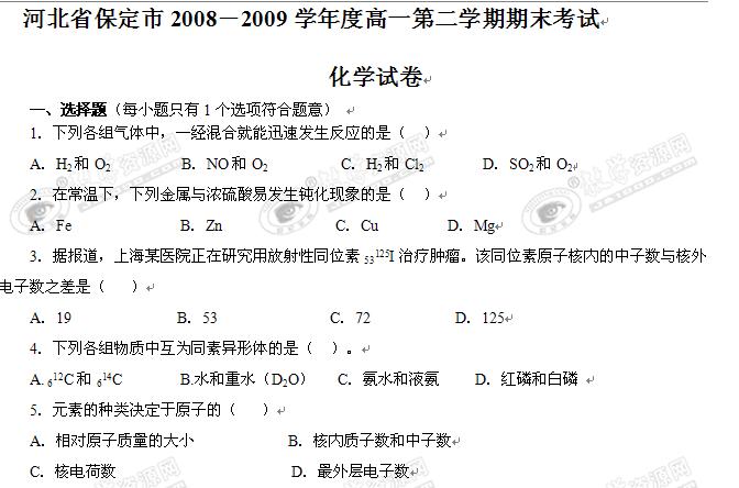 河北省保定市08-09学年高一下学期期末考试(化学)