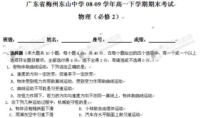 广东省梅县东山中学08-09学年高一下学期期末考试(物理)