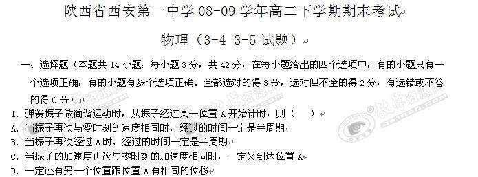 陕西省西安第一中学08-09学年高二下学期期末考试(物理)