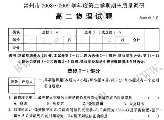江苏省常州市08-09学年高二下学期期末质量调研(物理)