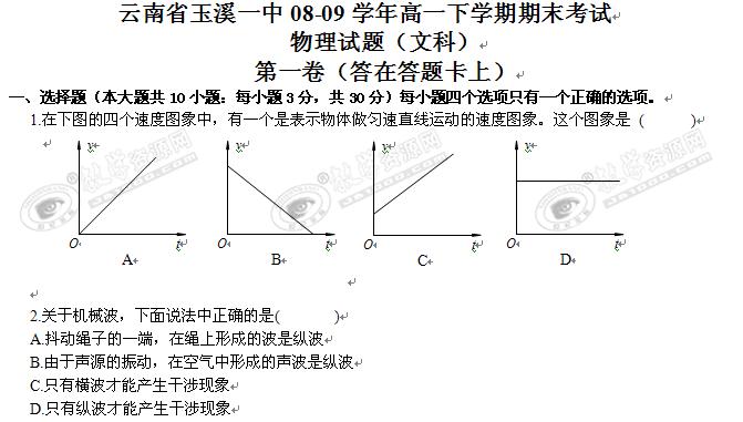 云南省玉溪一中08-09学年高一下学期期末考试(物理文)