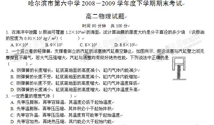 黑龙江省哈六中08-09学年高二下学期期末考试(物理)