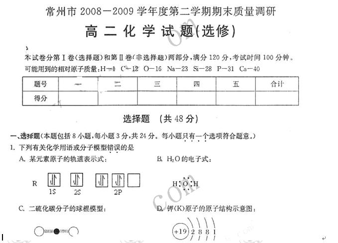 江苏省常州市08-09学年高二下学期期末教学质量调研(化学)扫描版