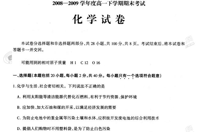 黑龙江省哈师大附中08-09学年高一下学期期末考试(化学)扫描版