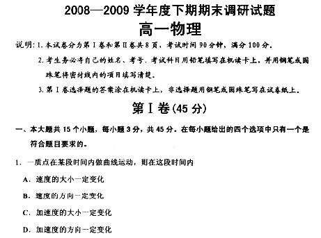 四川省双流县08-09学年高一下学期期末调研测试物理试卷