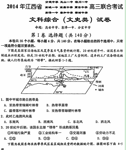 江西省九所重点中学2014届高三联合考试(文综)扫描版
