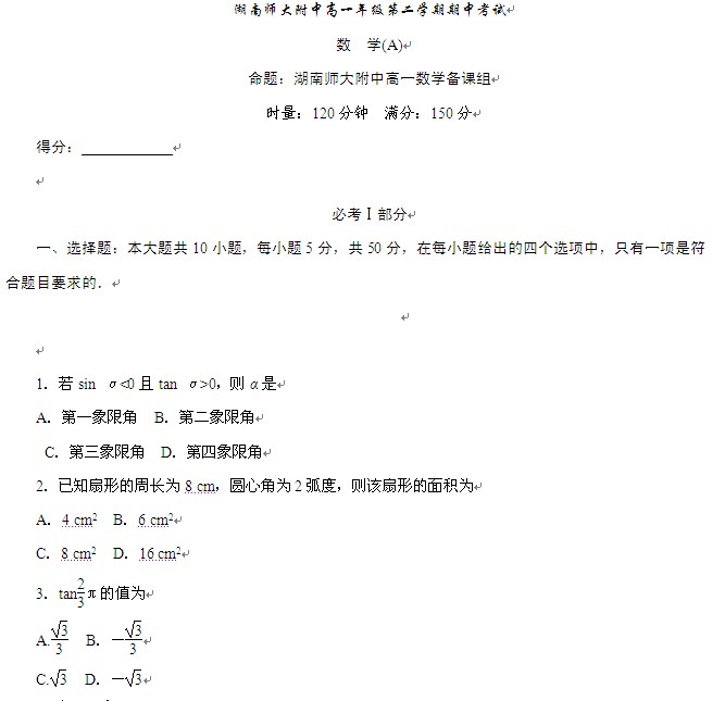 湖南师大附中2013-2014学年高一下学期期中考试(数学)(A卷)