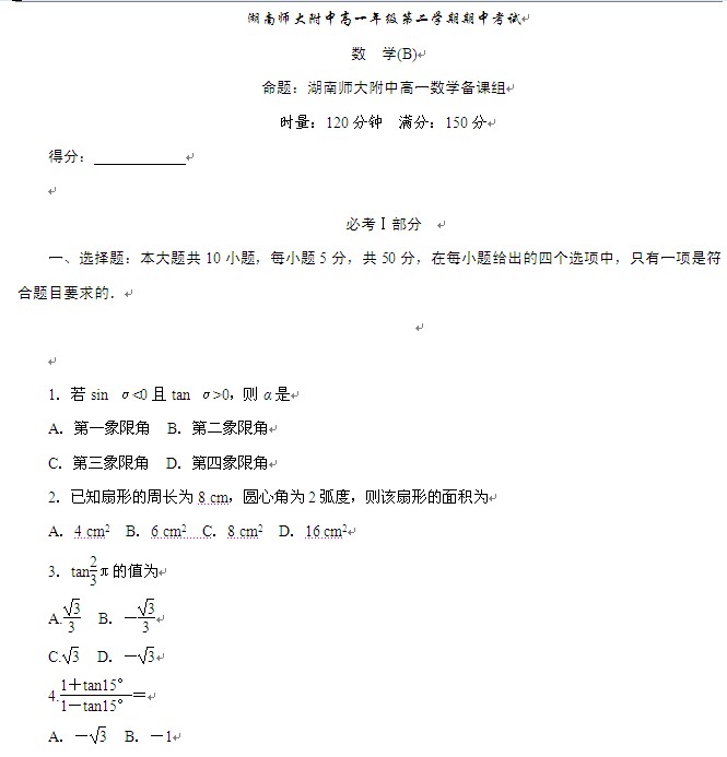 湖南师大附中2013-2014学年高一下学期期中考试(数学)(B卷)