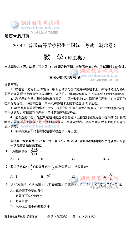 2014年普通高等学校招生统一考试(湖北卷)数学理 扫描版(含答案)