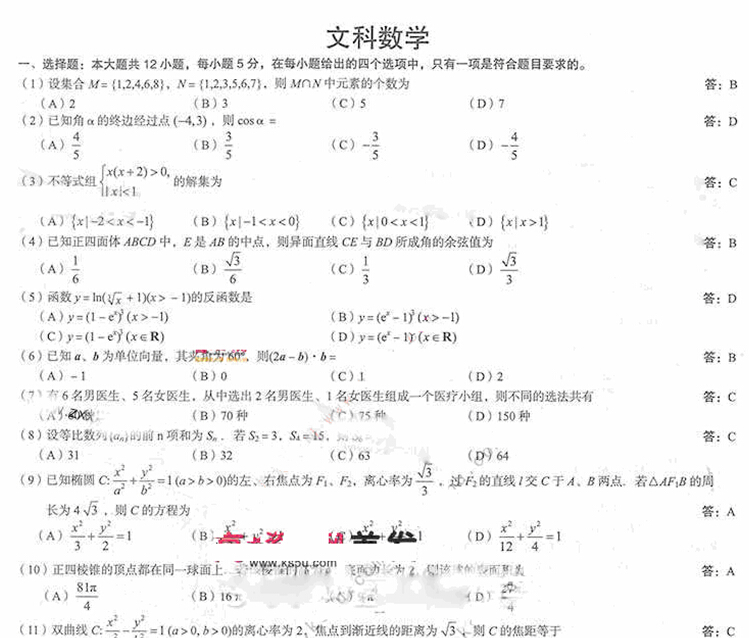 2014年普通高等学校招生全国统一考试全国大纲卷(数学文)扫描版