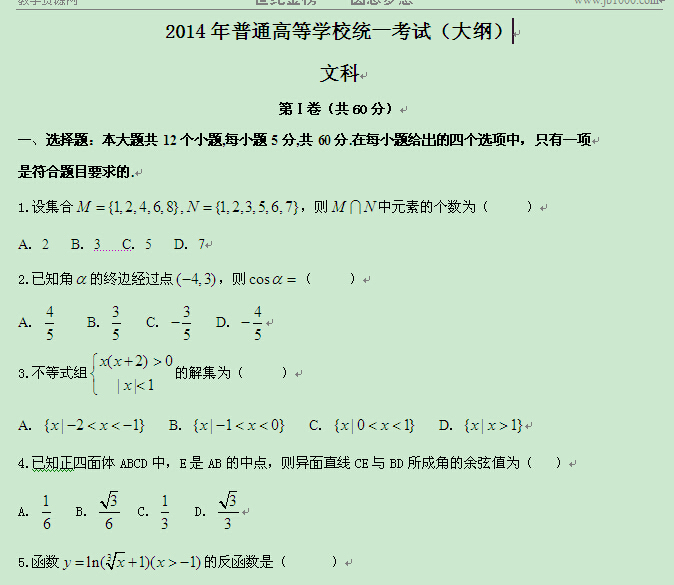2014年普通高等学校招生全国统一考试全国大纲卷(数学文)word版小题解析