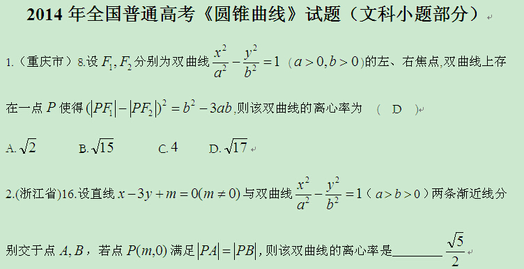 2014年高考《圆锥曲线》真题(文科小题部分)