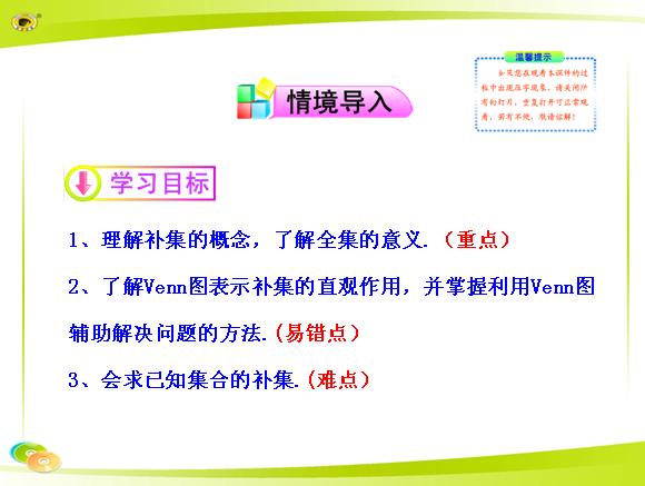 2013版高中数学课时讲练通多媒体教学课件:1.2 第2课时 补集、全集(苏教版必修1)