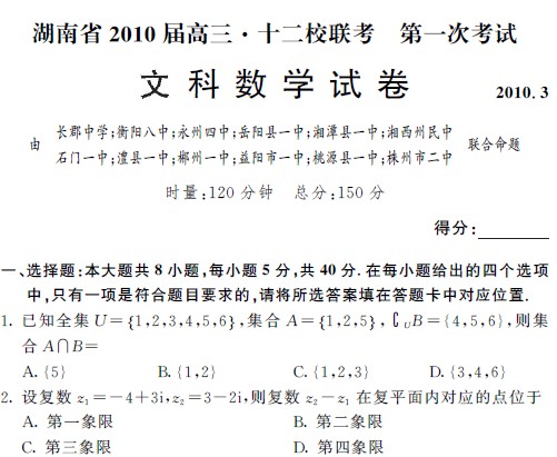 湖南省2010届高三十二校联考第一次考试(数学文)(PDF版)