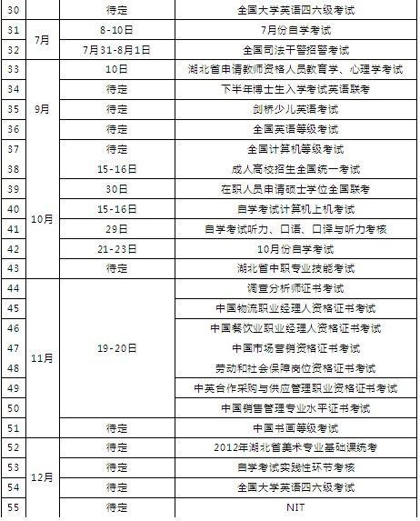 21日,湖北省教育考试院网站(http://www.hbea.edu.cn/)刊登我省2011年考试安排,公布全国研究生统考、普通高考等30多项重点考试的具体时间。
