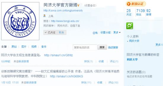 同济大学新浪官方微博发布该校2011年自主招生动态信息