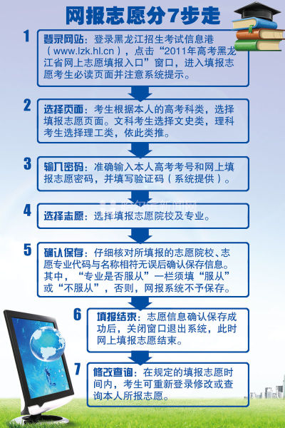 东北网6月7日讯 今年高考志愿填报仍将以网上填报的方式进行,即须由考生本人在黑龙江招生考试信息港(www.lzk.hl.cn)的2011年高考网上填报志愿窗口,按录取批次、程序、要求,在限定的时间内填报高考志愿。今年的网报志愿将分为6月15日至21日和7月27日至30日两时段进行,考生填报志愿时别忘7步程序和9大注意事项。据了解,考生网上所填报的志愿即成为考生电子档案中的志愿信息,是录取时是否投档的重要依据之一。今年我省高考的两次填报志愿和录取期间可能出现的各次征集志愿,一律通过网上进行。第一次填报志愿的时间为6月15日8时至6月21日8时,所填报的志愿是文史、理工类提前批,本科一批,本科二批院校;体育类本科批院校;艺术类提前批,本科一批,本科二批院校。第二次填报志愿时间为7月27日8时至7月30日8时,所填报的志愿是文史、理工类本科三批和所有各批次的高职(专科)院校。艺术类本科提前批设一个院校志愿,其他批次均设两个院校志愿(本科二批录取院校中本科中外合作办学院校单设二个志愿在第一次填报,单独划定全省最低录取控制分数线并在本科二批一般本科院校录取结束后录取),每个院校均设五个专业志愿(艺术类设两个专业志愿)和一个专业是否服从志愿。