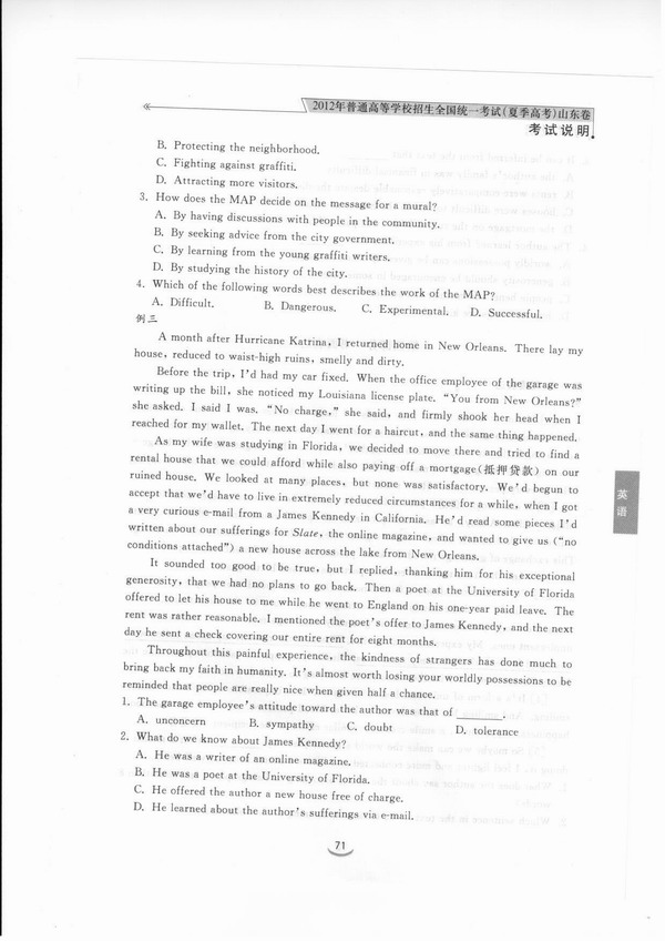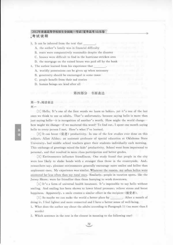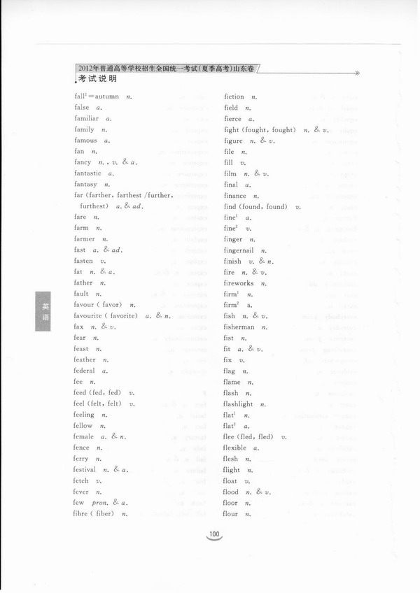 2012年普通高等学校招生全国统一考试(夏季高考)山东卷英语考试说明