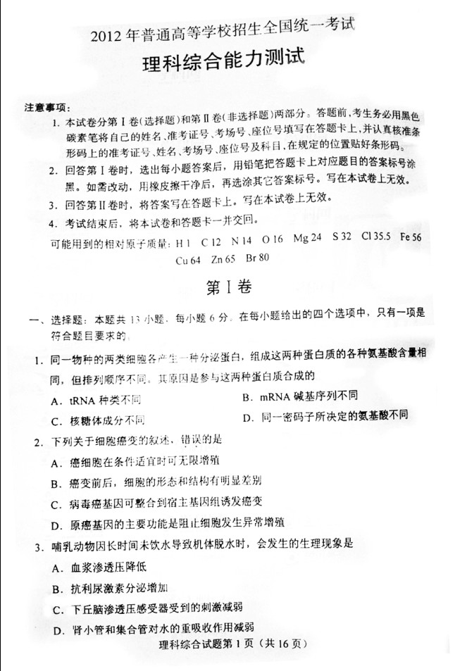 2012年普通高等学校招生全国统一考试陕西卷(理综)扫描版无答案